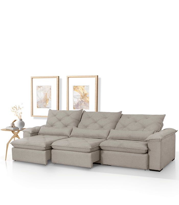 | Assento | Retrátil nos assentos, pillow com espuma soft costurado no tecido, espuma D-33 Soft, duplo molejo composto por molas espiral e molas pocket. |
